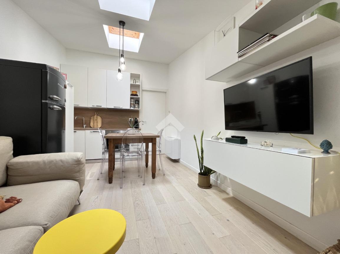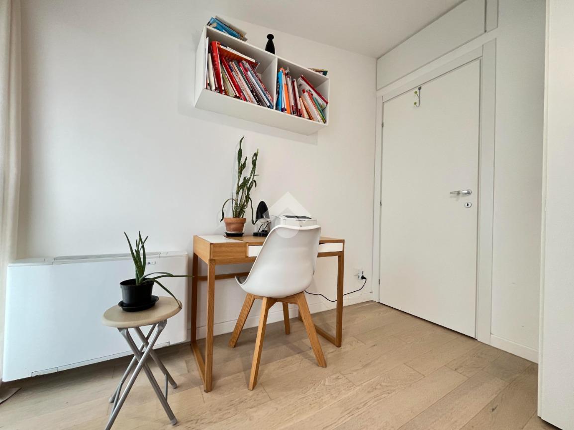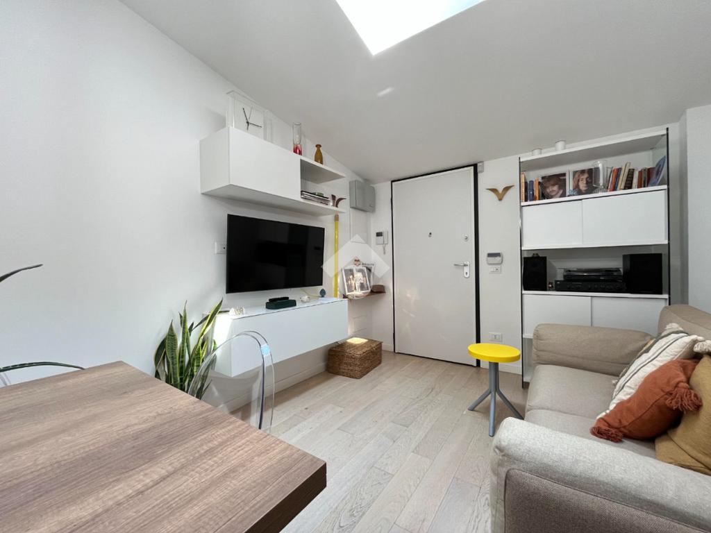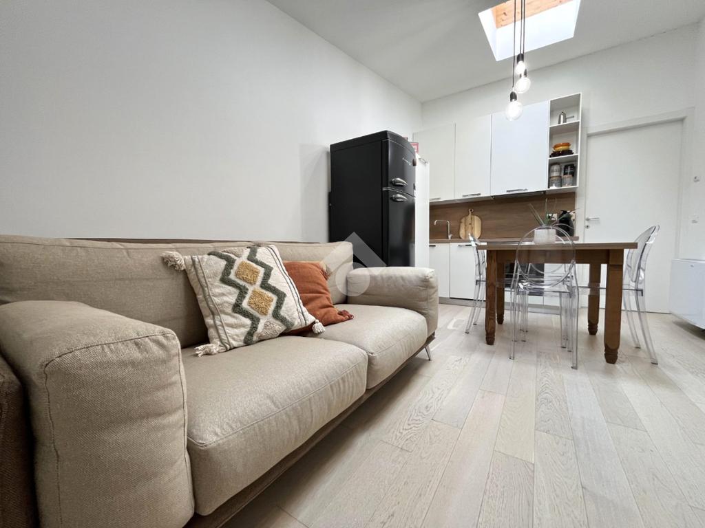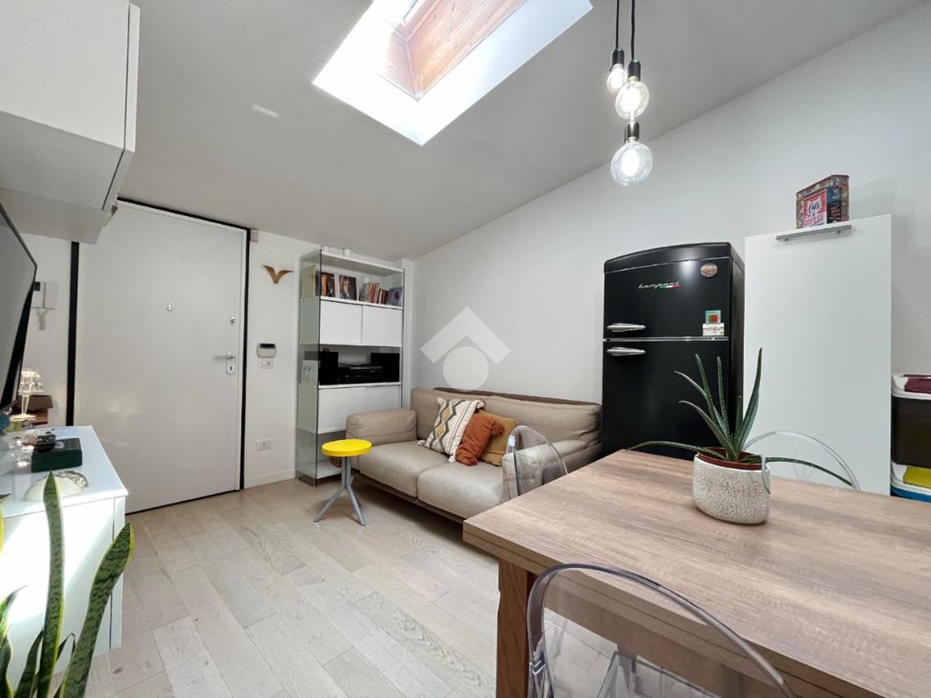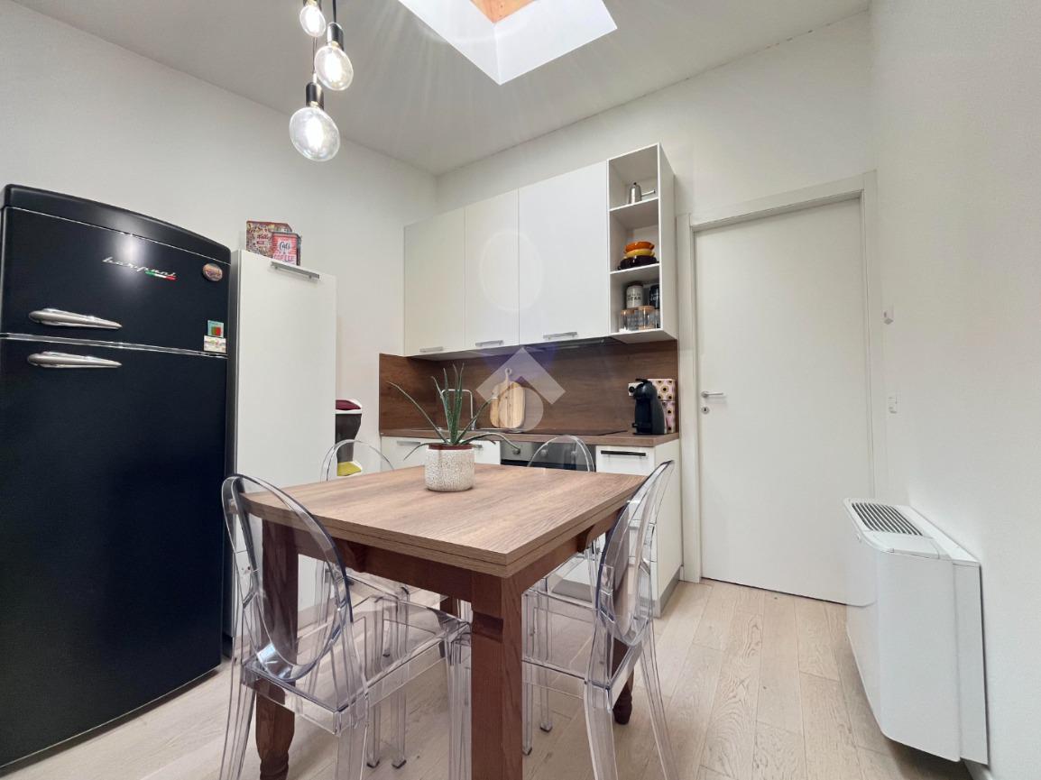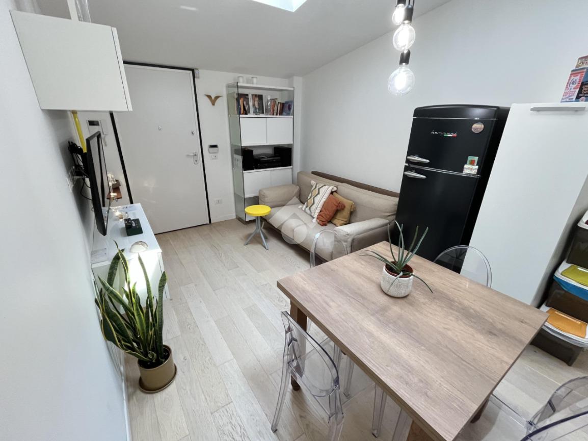L'appartamento si compone di ingresso sulla zona giorno con cucina a vista, disimpegno, bagno con doccia finestrato tramite velux e servito da un ripostiglio in quota e infine due camere una delle quali è attualmente adibita a studio.