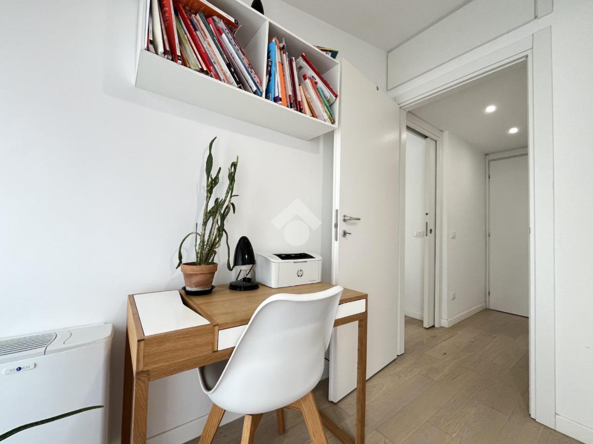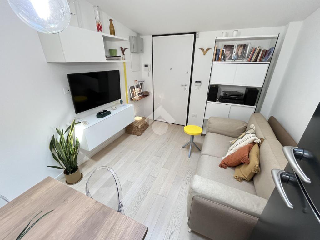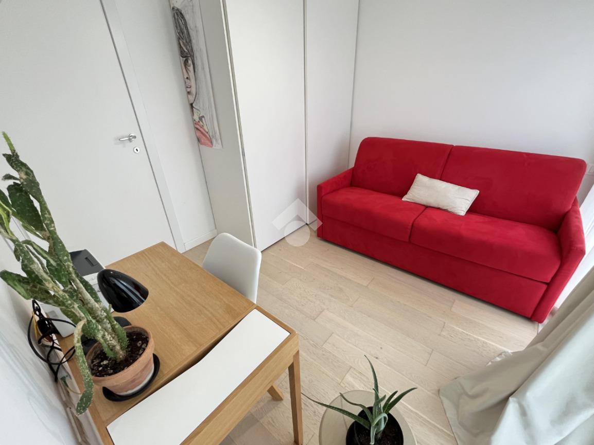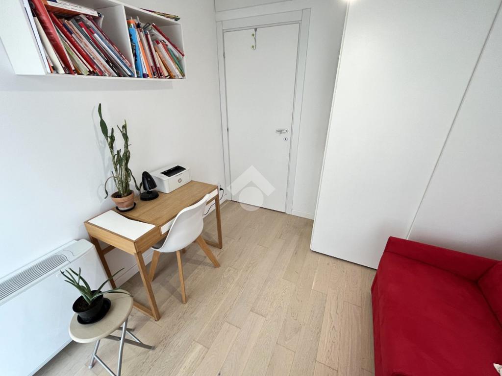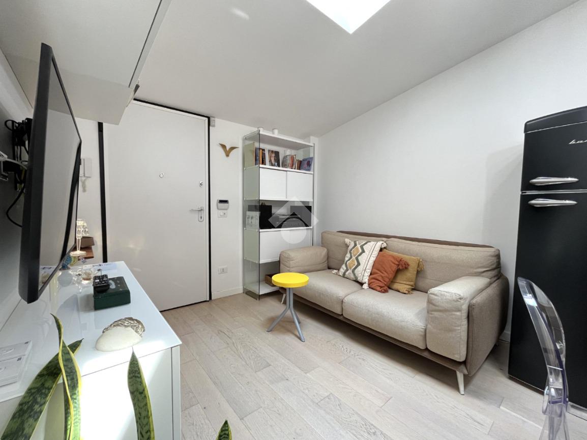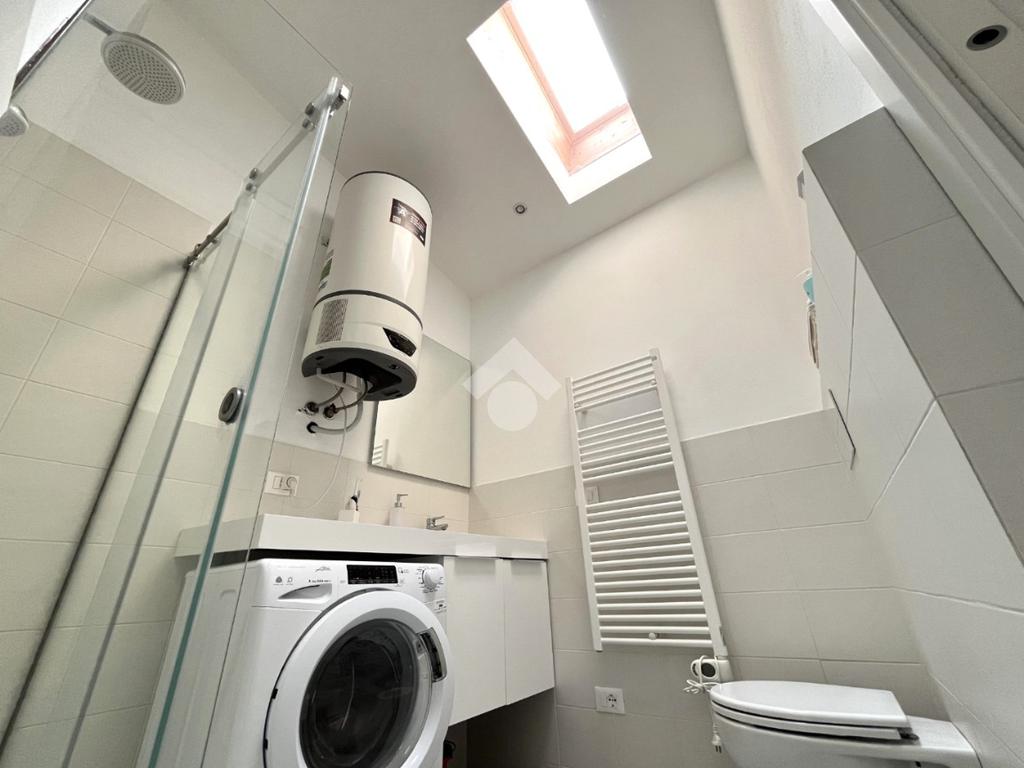 L'appartamento si compone di ingresso sulla zona giorno con cucina a vista, disimpegno, bagno con doccia finestrato tramite velux e servito da un ripostiglio in quota e infine due camere una delle quali è attualmente adibita a studio.