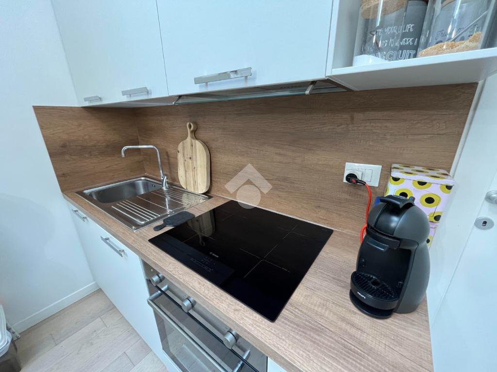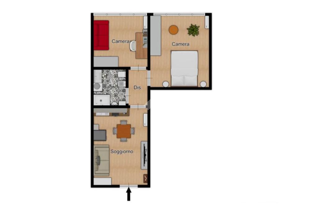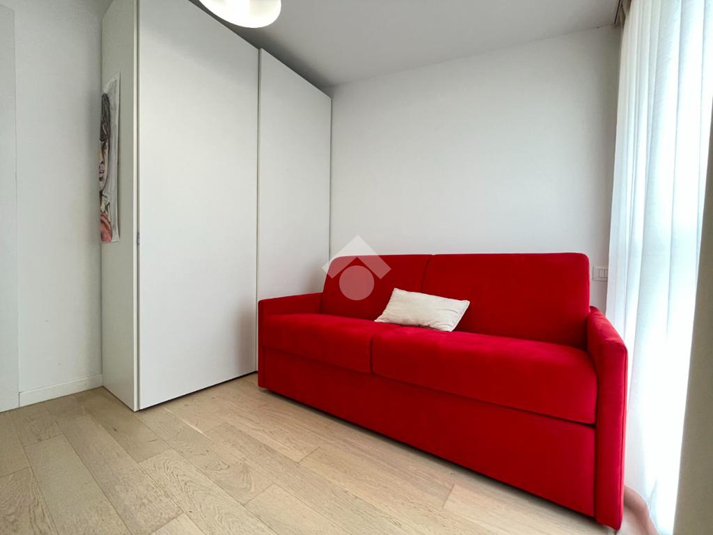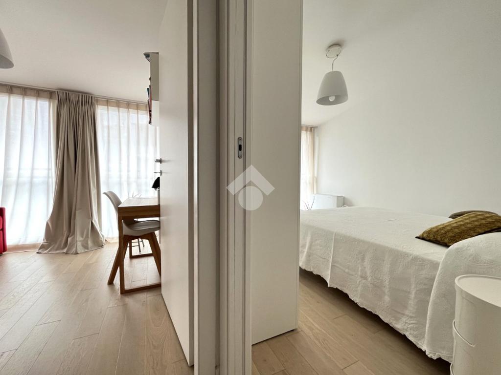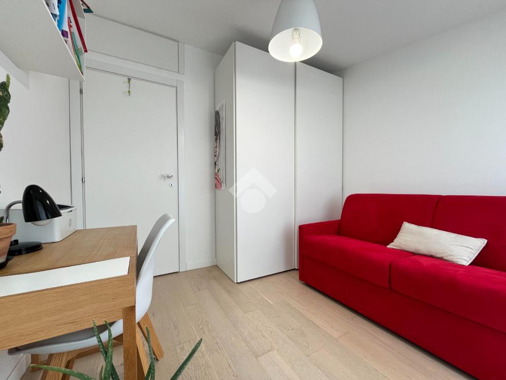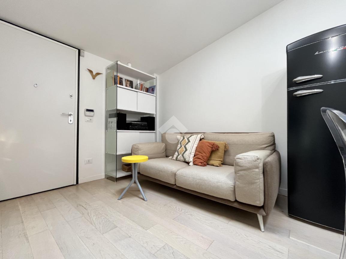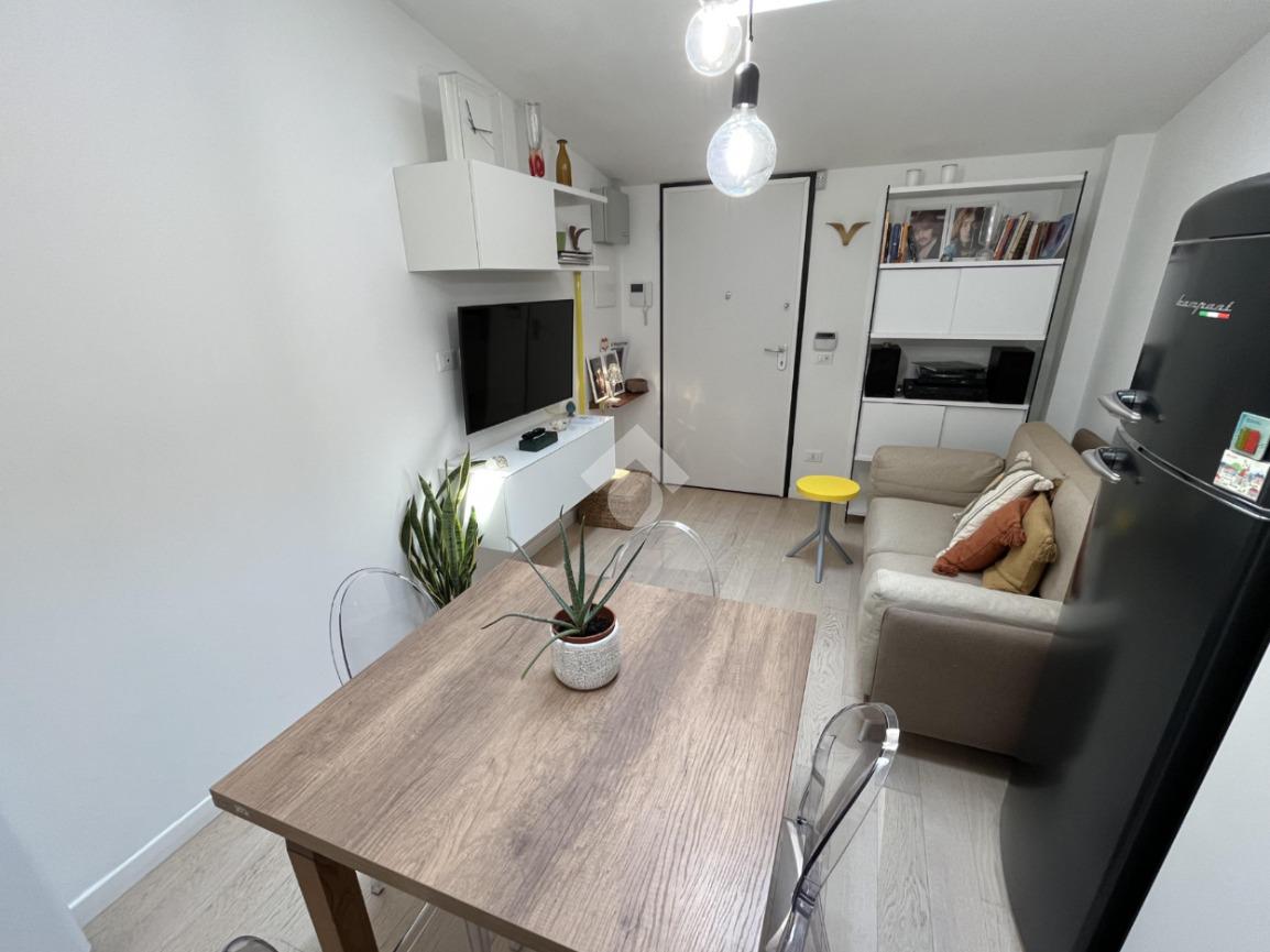 L'appartamento si compone di ingresso sulla zona giorno con cucina a vista, disimpegno, bagno con doccia finestrato tramite velux e servito da un ripostiglio in quota e infine due camere una delle quali è attualmente adibita a studio.