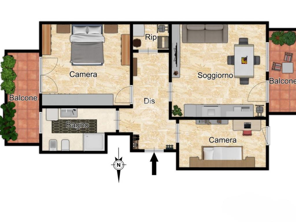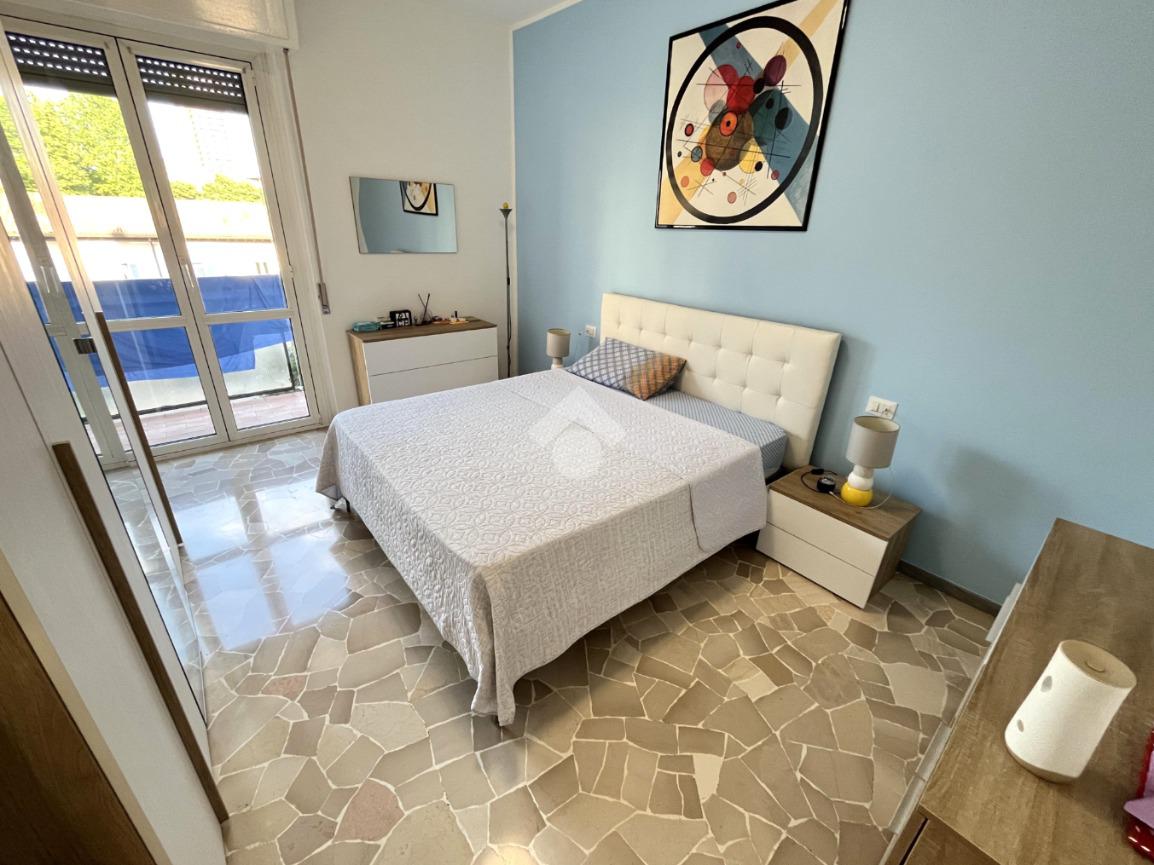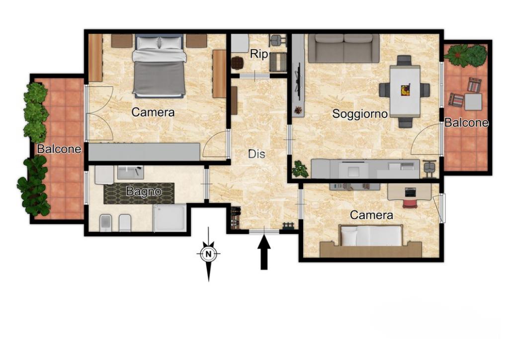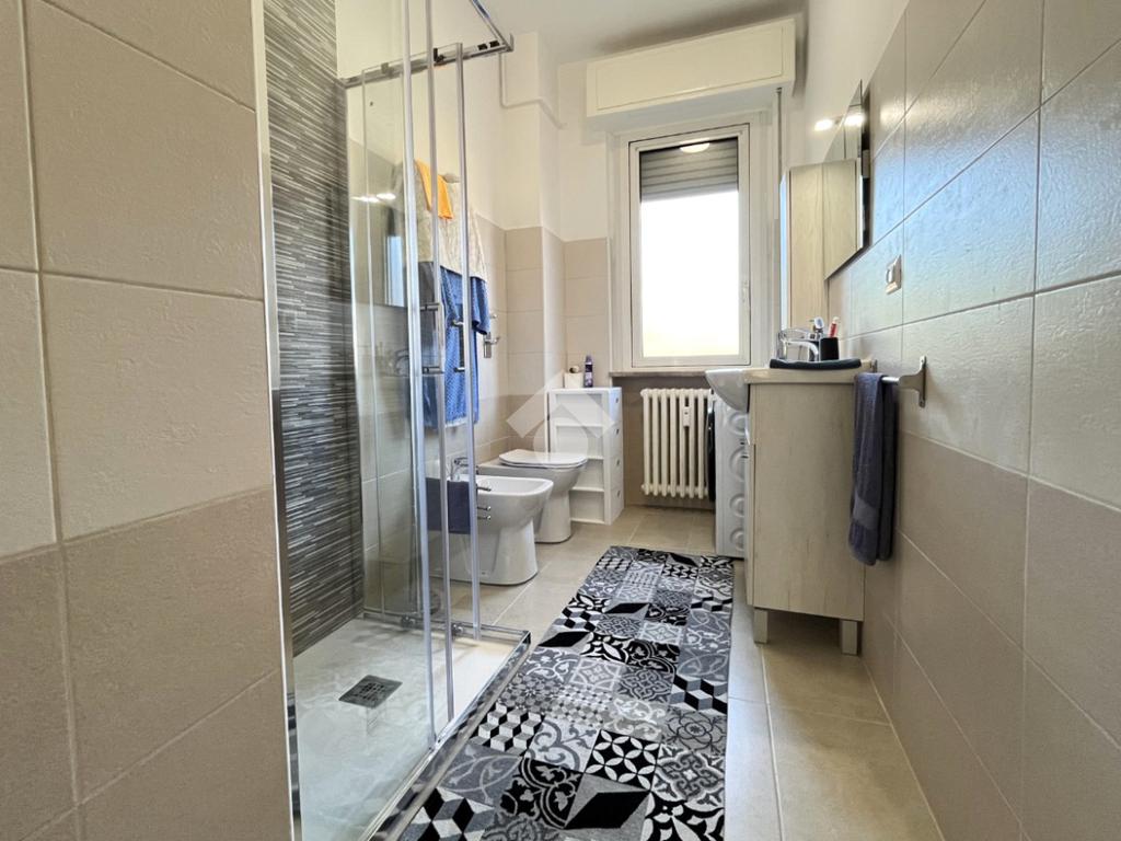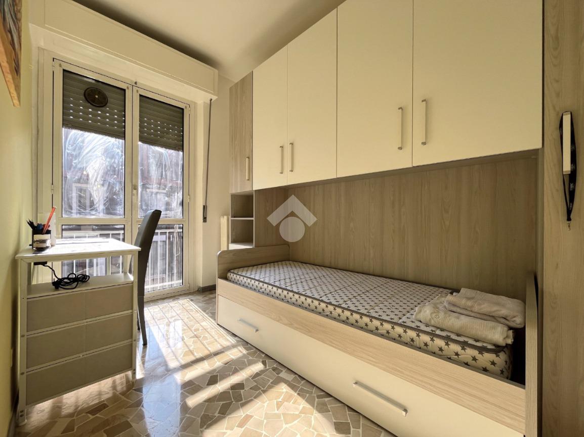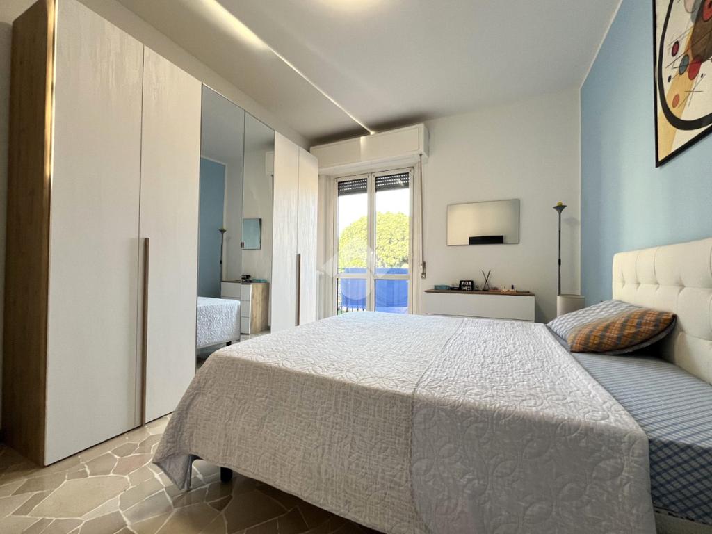 L’appartamento si compone di tre locali ben distribuiti ed è così disposto: ingresso su disimpegno con accesso a un comodo ripostiglio, soggiorno con cucina a vista e balcone, camera da letto matrimoniale con accesso al secondo balcone, camera singola con balconcino alla francese e ampio bagno finestrato con box doccia. La doppia esposizione est-ovest e la numerosa quantità e ampiezza dei punti luce rendono l’appartamento molto luminoso e arieggiato, inoltre il doppio balcone offre la possibilità di godere di uno spazio esterno a tutte le ore del giorno al sole o alla tranquillità dell’ombra per le calde giornate estive.