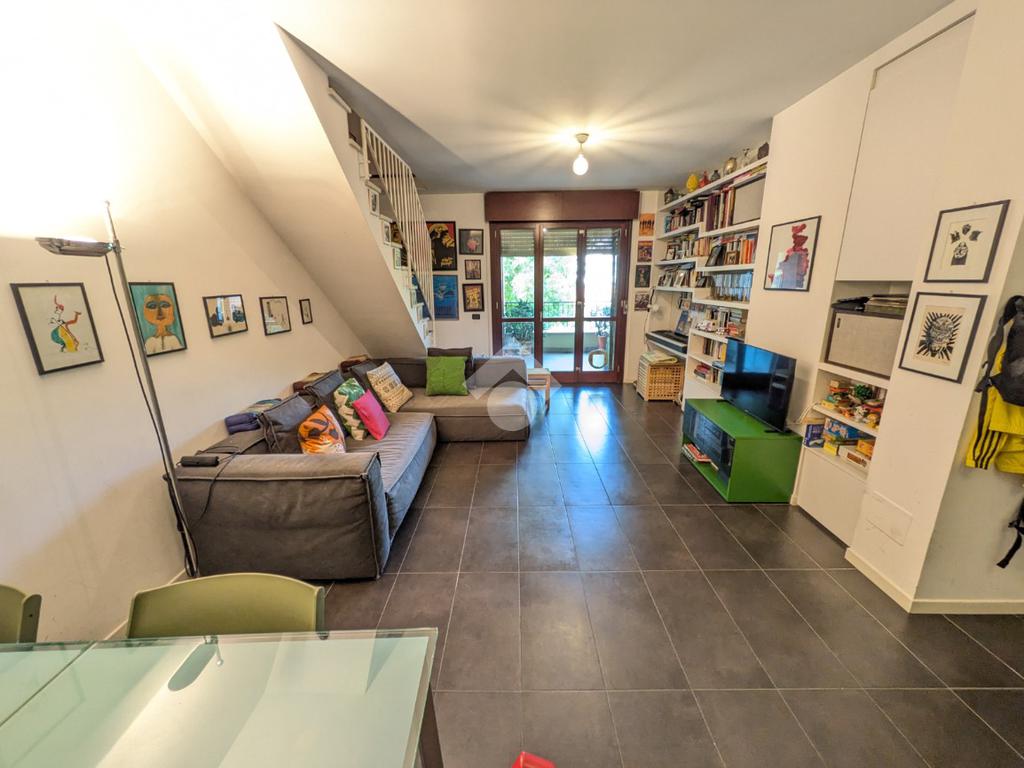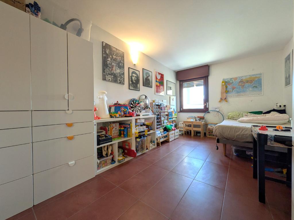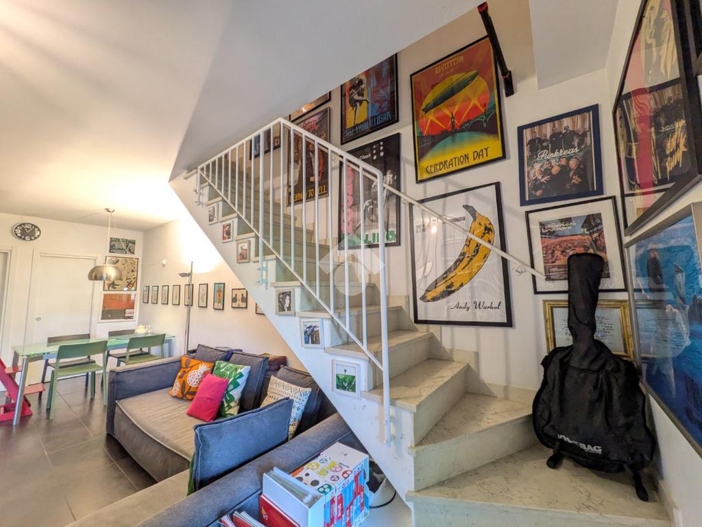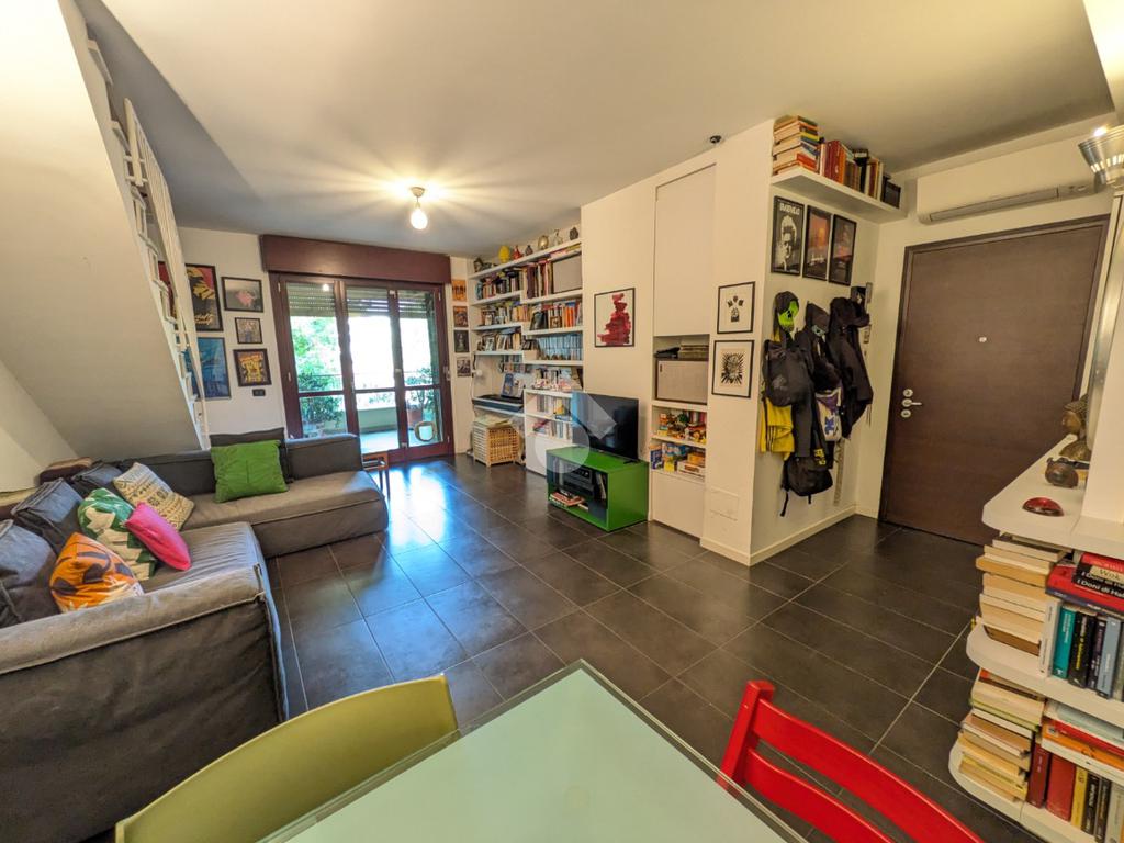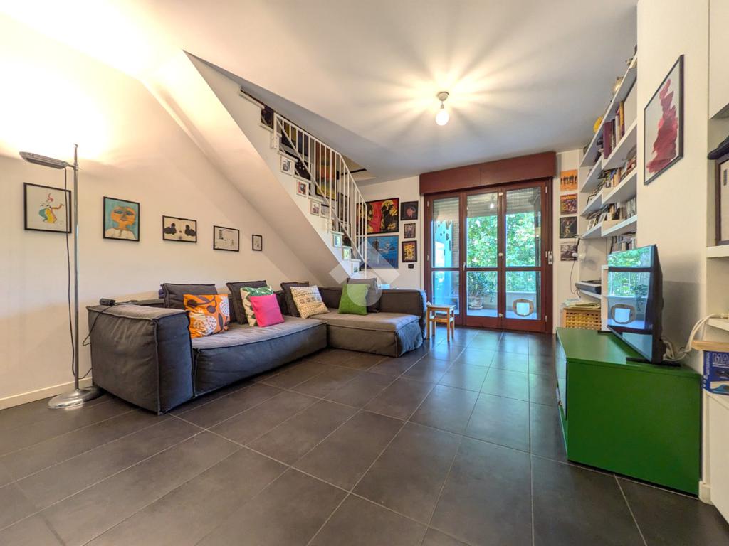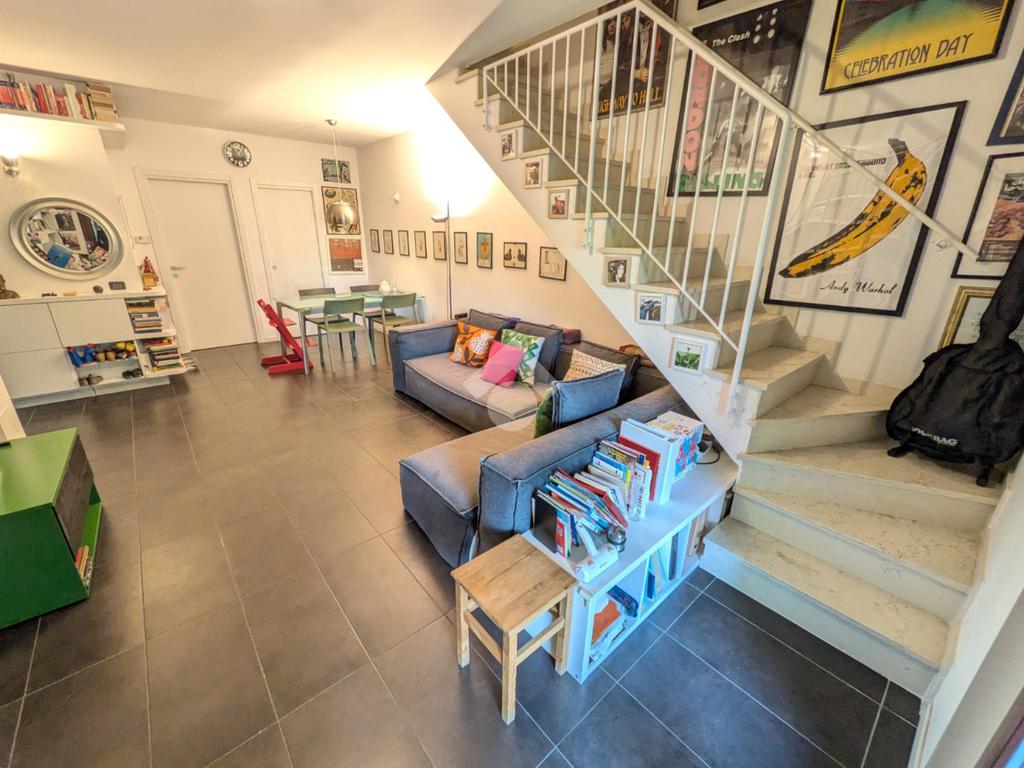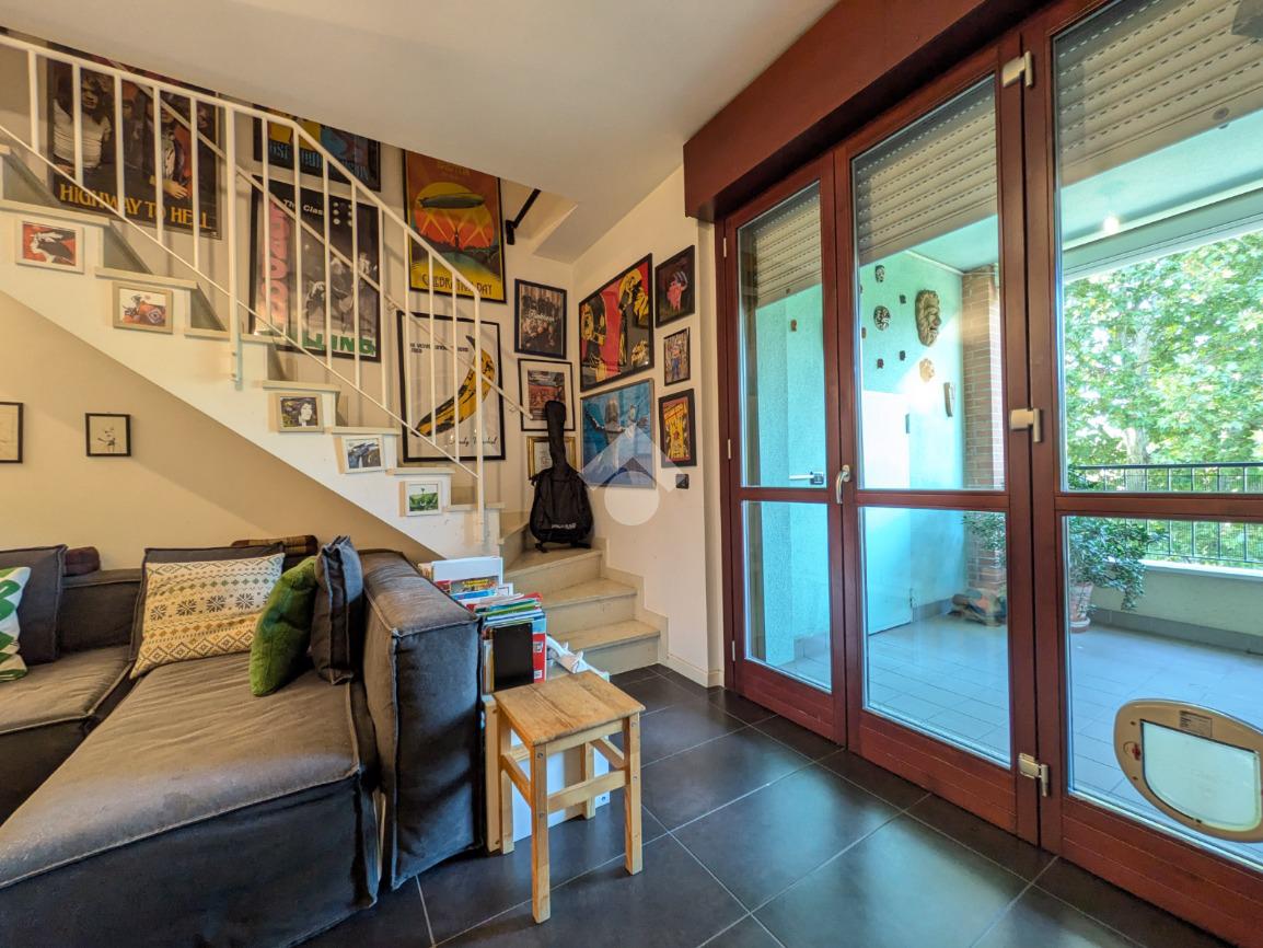 L’appartamento si compone di ingresso su ampia zona giorno con accesso a un terrazzino loggiato con piacevole vista sul verde, luminosa cucina separata, bagno finestrato con box doccia e antibagno con lavanderia; tramite una scala si accede alla zona notte al piano superiore composta di disimpegno, ampia camera matrimoniale, seconda camera con accesso al secondo terrazzino e bagno di servizio con box doccia.