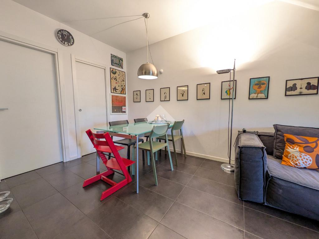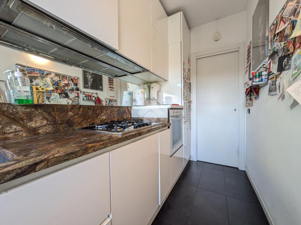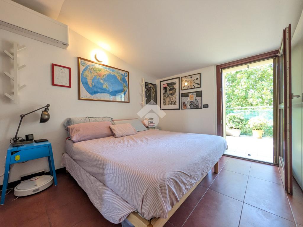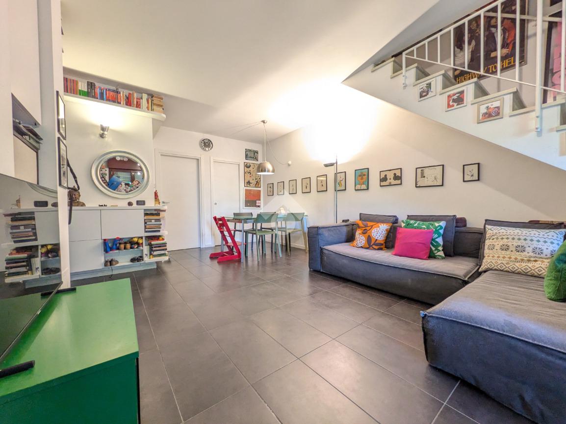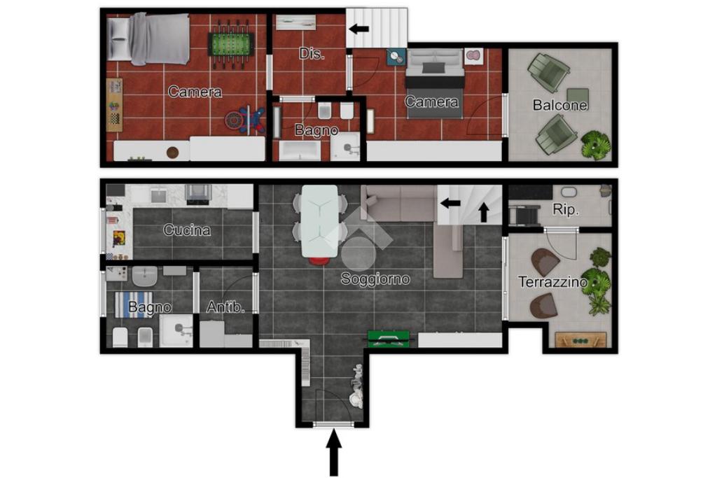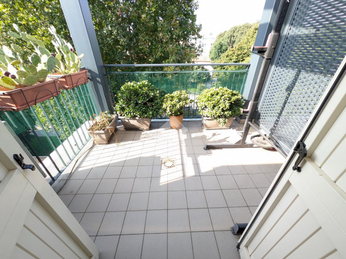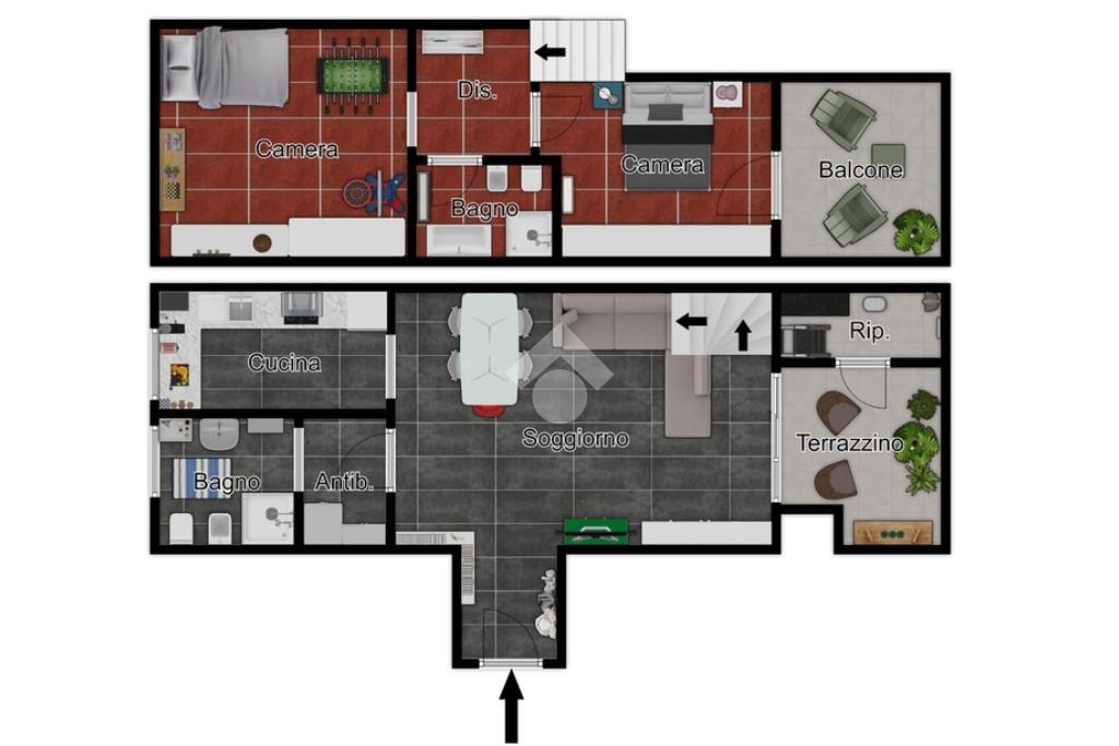 L’appartamento si compone di ingresso su ampia zona giorno con accesso a un terrazzino loggiato con piacevole vista sul verde, luminosa cucina separata, bagno finestrato con box doccia e antibagno con lavanderia; tramite una scala si accede alla zona notte al piano superiore composta di disimpegno, ampia camera matrimoniale, seconda camera con accesso al secondo terrazzino e bagno di servizio con box doccia.