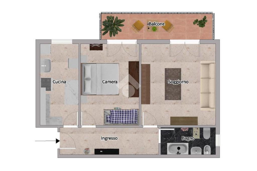 L'appartamento si compone di ingresso su corridorio, soggiorno con accesso a un ampio balcone, cucina abitabile, camera matrimoniale con secondo accesso al balcone e bagno finestrato con vasca.