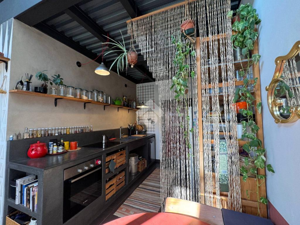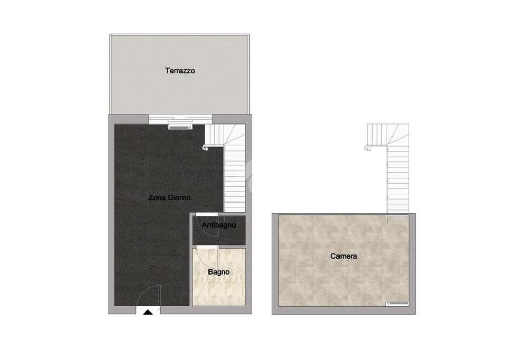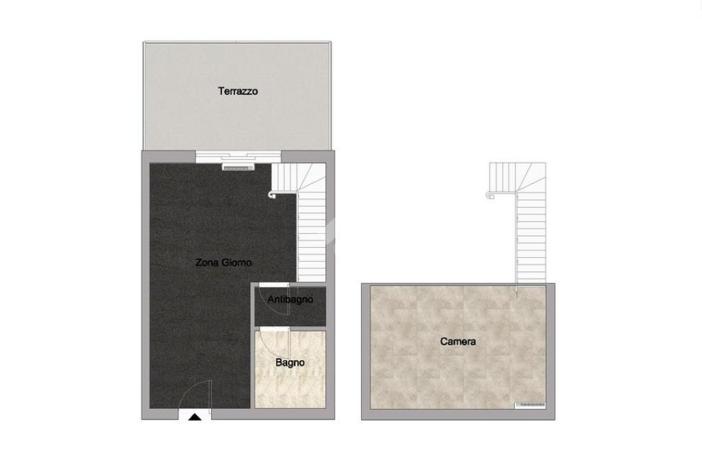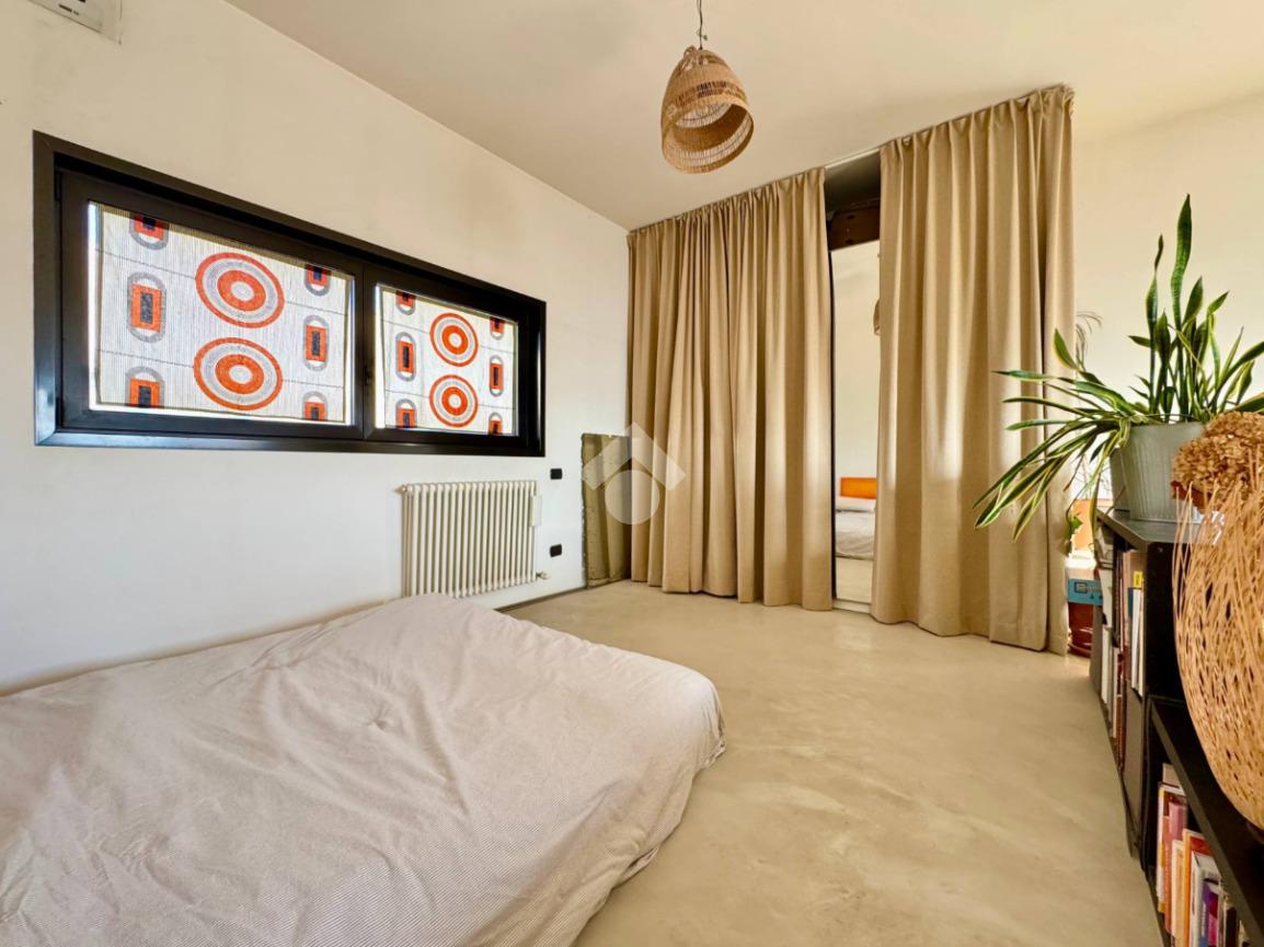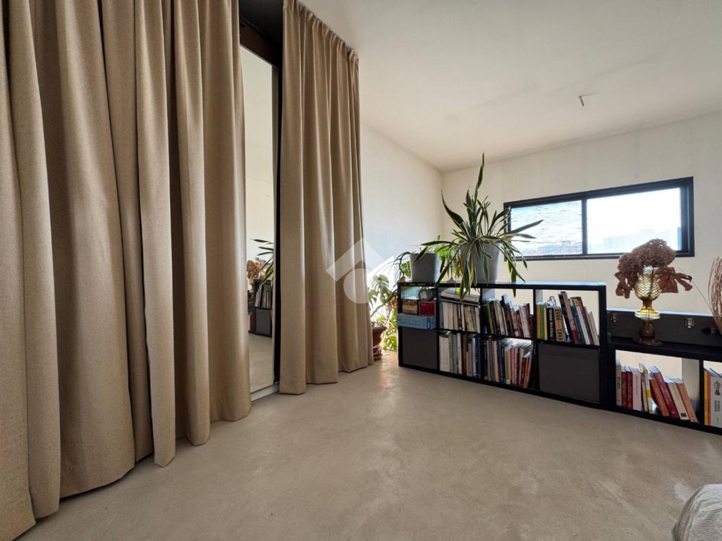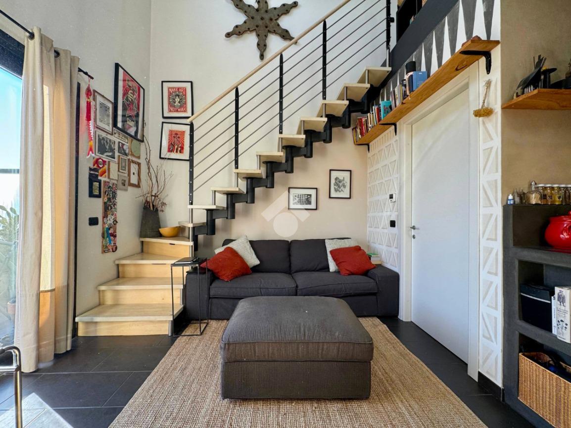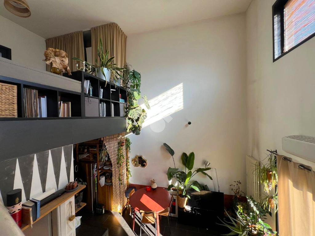 La soluzione è così composta: ingresso su zona cucina, soggiorno con accesso al terrazzo, comodo antibagno con lavanderia, bagno finestrato con box doccia, camera matrimoniale su soppalco. Le ampie vetrate e l’altezza dei soffitti caratterizzano l’ambiente, rendendolo luminoso e accogliente.